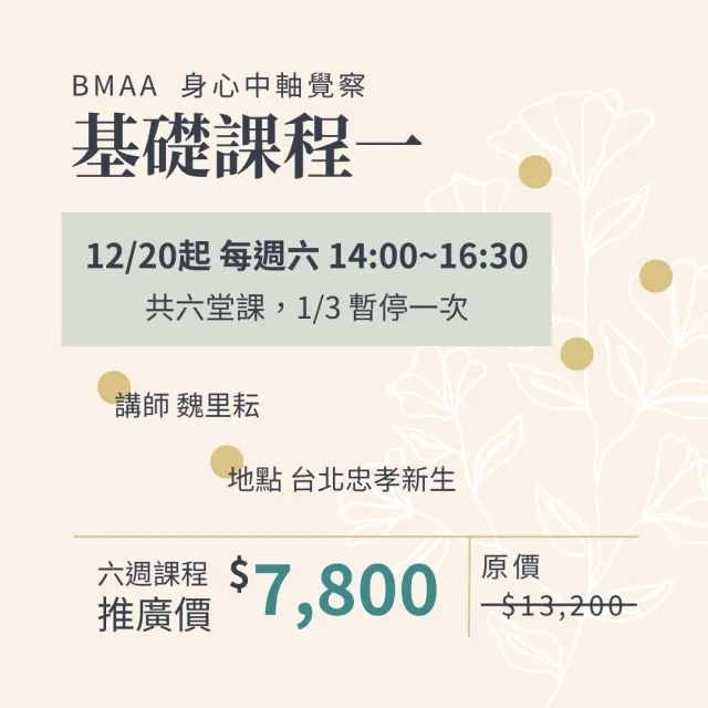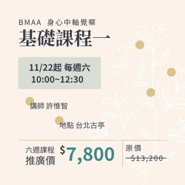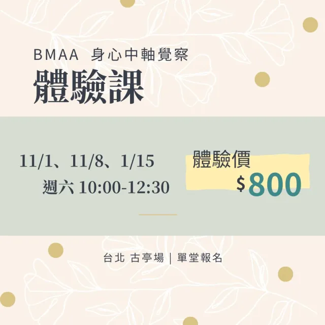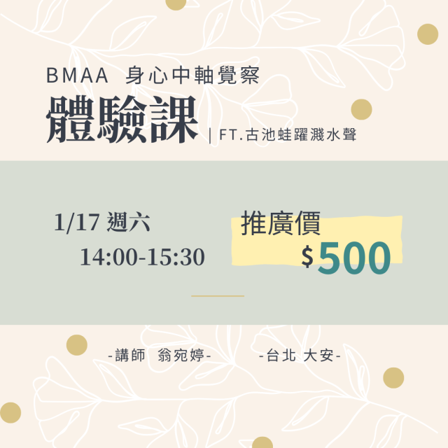 身心中軸覺察是帶領人找回身心平和安頓的根本方法,而這堂課會帶領你學會這個方法。近年來心理學研究越來越重視身心之間的相互影響。這套練習同時從身心下手,從放鬆身體、放空腦袋開始,逐漸感受身體的中軸線,體會中正放鬆的狀態,並讓我們處在一種覺察有彈性的狀態。心靈保持覺察,身體能夠隨心調整狀態,這正是人的理想狀態。